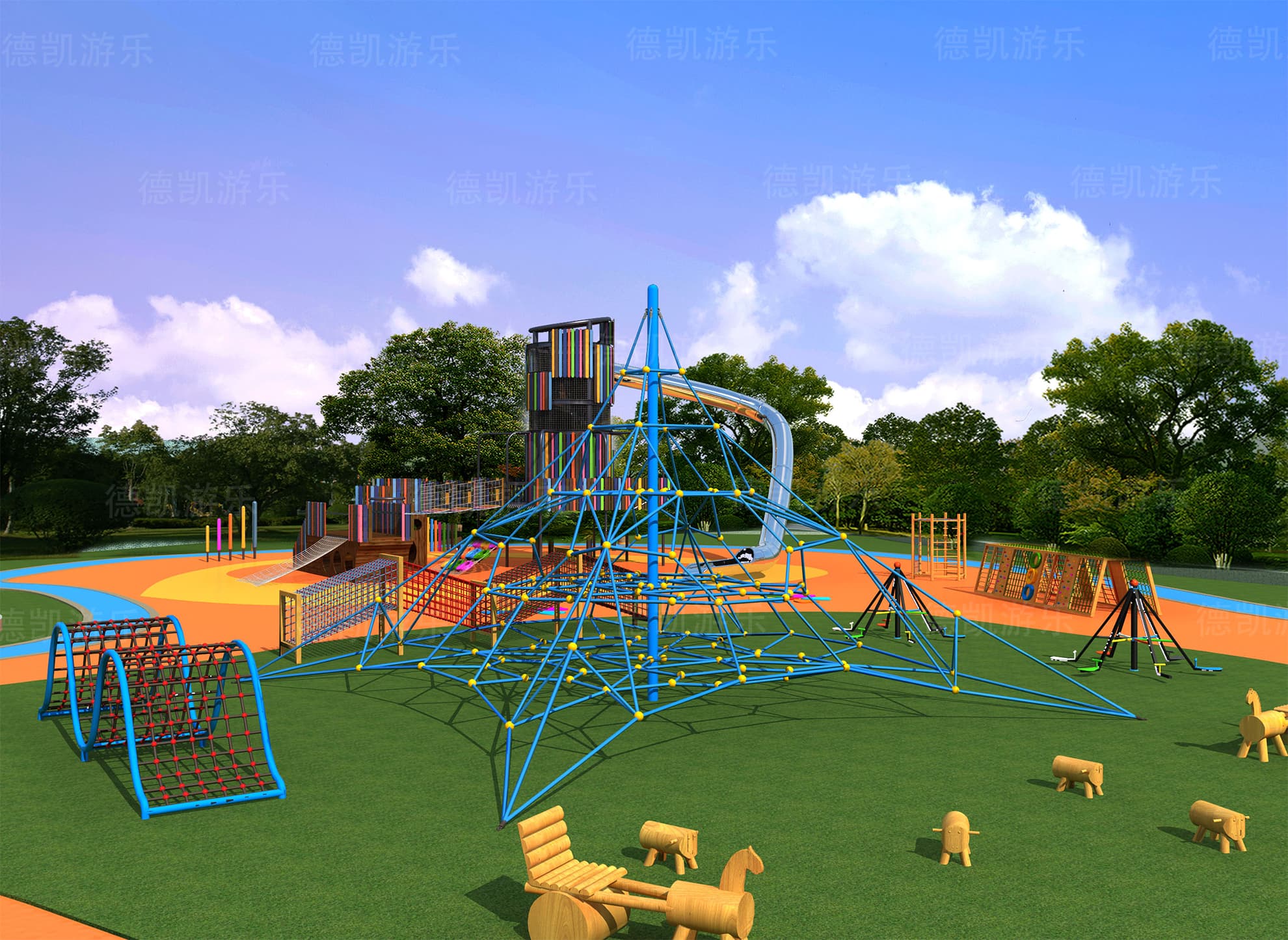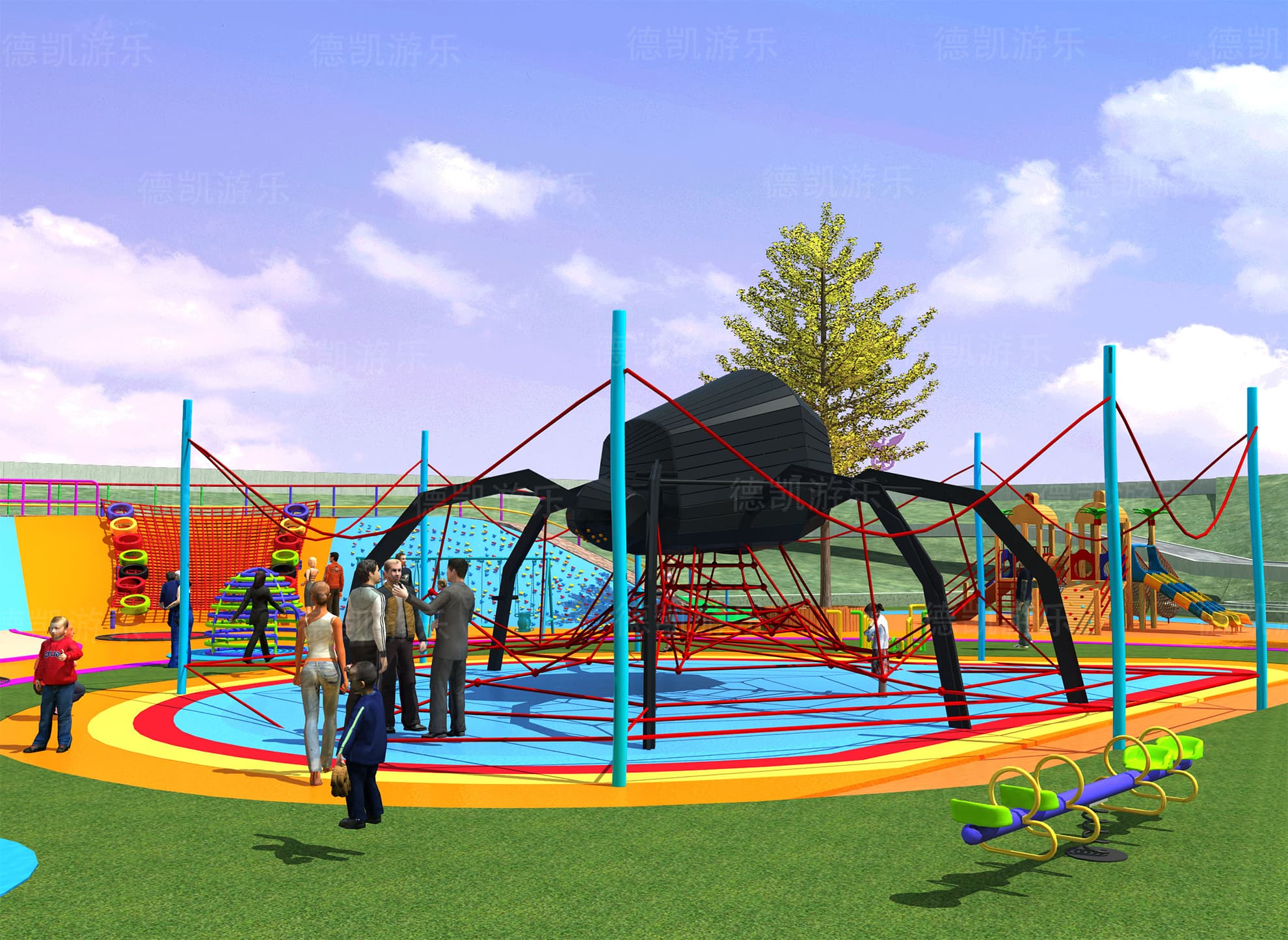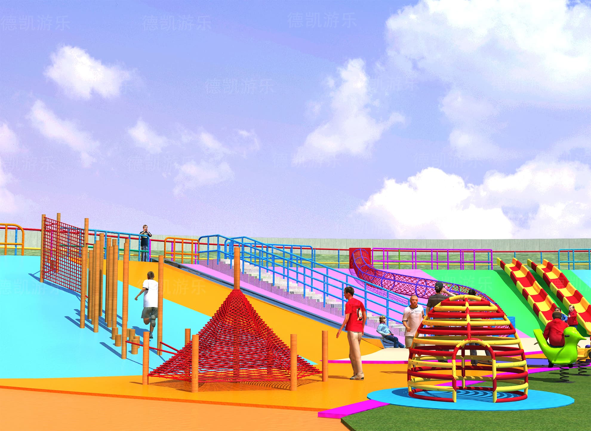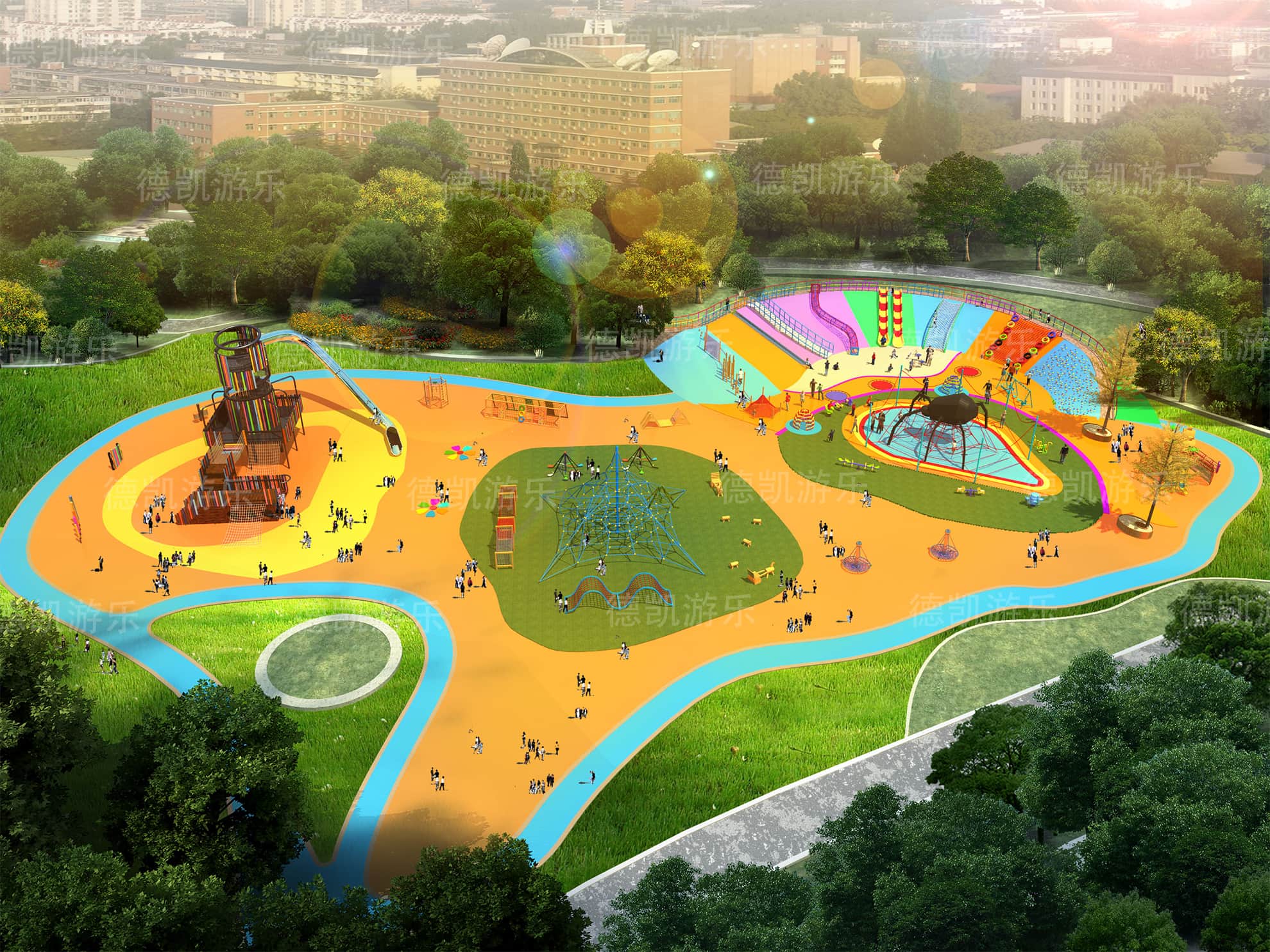在總體效果圖中,我們大致可以看見這個游樂園的主要游樂設備:主體七彩滑梯、勇攀高峰、鉆網、拓展組合、地形游樂、蜘蛛游樂,且每個設備都有各自的區域范圍,構成了這個完整的游樂園。游樂園也周圍環境相融合,融入到這座城市當中,完善著城市的基礎功能。